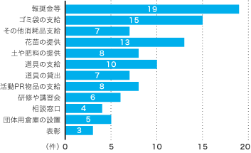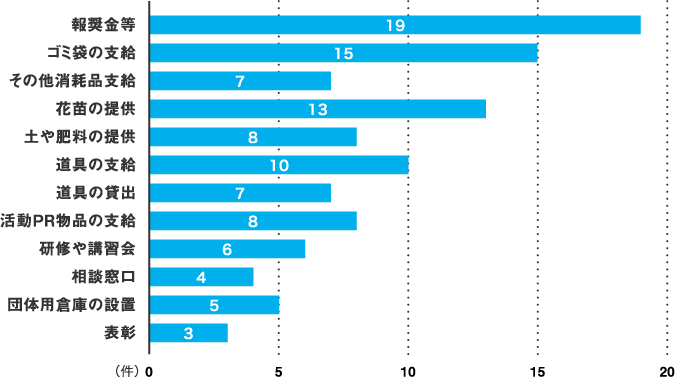 報奨金等を交付する自治体が最も多かった。報奨金の他、交付金や委託費などの名目もあったが、金額の算出方法は、どちらも面積に応じて決められる場合が多かった。並行して、ゴミ袋などの消耗品や花苗・土や肥料の提供、道具の支給や貸し出し、団体用倉庫の設置など、物品支援がある自治体もあった。また、研修や講習会、個別支援など技術支援の充実を図っている自治体もあり、支援の方法や内容には、自治体ごとの個性が出る結果となった。その他にも、活動PRのための看板や帽子の支給、公園への掲示板の設置、相談窓口、表彰、保険の加入、公園利用手続の簡素化など、市民の活動しやすさをサポートする支援内容もあった。