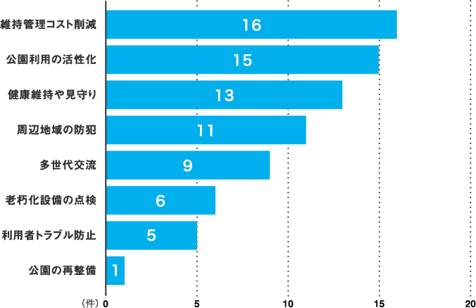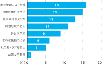 「公園愛護会等がもたらしている価値や効果についてどのようなことがありますか?もしも、なくなってしまったら、どのような損失がありますか?」という質問(複数回答可)に対して、回答したうちの73%の自治体が、街区公園の維持管理のコスト削減に有効だという結果であった。そのほか、地域住民による公園利用の活性化(68%)高齢者の健康維持やご近所見守り効果(59%)、周辺地域の防犯(50%)や、地域における多世代交流(41%)、老朽化しつつある設備の点検や小修繕(27%)、公園利用者や近隣住民のトラブル防止効果(23%)と続いた。除草や落ち葉清掃などコスト面のメリットともに、住民同士の交流の機会になっていること、また、住民自らが地域に関わることで地域の愛着形成にもなること、地域の目があり人の手が入っていることで街の美化と防犯にも寄与していることが改めて確認できた。