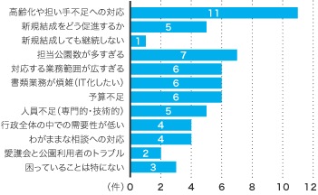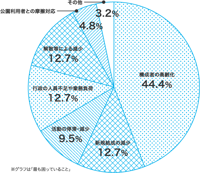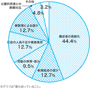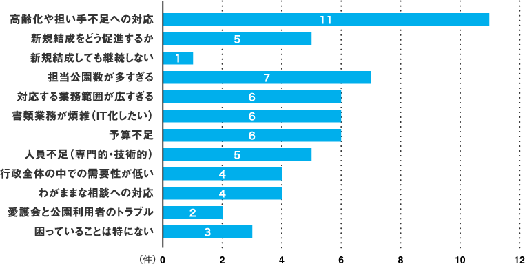 公園愛護会などの公園ボランティアが抱える課題(複数回答可)について、回答した自治体のうち80%が構成者の高齢化を選択。次いで会員の新規加入がない(57%)、愛護会との連絡・相談・広報などの人員不足や業務負荷(48%)、解散等による愛護会の減少(43%)、新規結成の減少(38%)、活動の停滞・減少(33%)と続いた。その中で最も困っている課題について1つ挙げる設問でも、4割以上が構成者の高齢化であった。既存の愛護会員の高齢化が進むと同時に、会員の新規加入も少ないため、愛護会の活動が減少していること、さらには活動が存続できず解散に至る例も増えている現状が見える。また、行政側の人員および予算不足のため、研修や講習会等の技術支援等のサポートが難しいことや、各団体との情報共有の難しさ、自治会・町内会以外の新たな担い手探しについても言及があった。