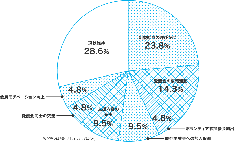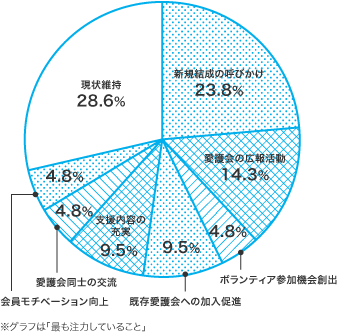 公園愛護会等に対して、自治体として力を入れていること、工夫していること(複数選択可)については、回答した自治体のうち48%が新規結成に向けた呼びかけを選択した。その他、市民にもっと愛護会を知ってもらうための広報活動(29%)、市民の気軽なボランティア機会の創出(10%)など、愛護会の減少に対して、新たな担い手の掘り起こしを目的とした内容が多かった。一方、愛護会への支援内容の充実(19%)、既存愛護会への加入者を増やすための支援(19%)、愛護会同士の交流の促進(15%)、愛護会相談窓口の強化(10%)といった、既存愛護会へのサポート充実に注力した内容も一定数あった。年1~2回の連絡会を開催し愛護会同士の交流や情報共有を図ったり、活動の様子や活動マニュアルをホームページで公開したり、表彰制度を設けたりする自治体もあり、独自の工夫が見られる。最も注力している事については、およそ4割が新たな担い手の掘り起こしに関する内容、また3割が既存愛護会への支援関連、残りの3割が現状維持・特にないと回答した。