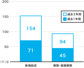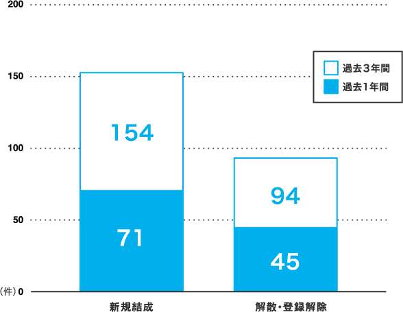 愛護会等団体の最近の新規結成の状況について、回答のあった自治体のうち78%で、2020年に新規結成された団体があることがわかった。過去3年間の数増減について、新規結成数と解散/登録解除の数を比較すると、新規結成(154件)、解散(94件)で、新規結成の方が多い結果となった。ここ1年間(2019/10-2020/9)と3年間(2017/10-2020/9)について、公園数を基準に算出した。回答のあったうちの6割が、解散に比べ新規結成が上回る結果となった。高齢化に伴う活動減少が叫ばれているが、多くの自治体で新しく団体を結成して活動を始める人々がしっかりと存在していることが分かる結果となった。