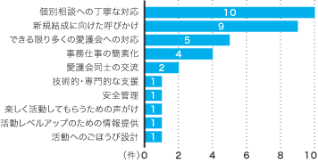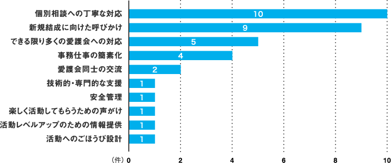 担当として力を入れている支援について(複数選択可)は、個別相談への丁寧な対応(48%)が最も多かった。次いで、新規結成に向けた呼びかけ(43%)、できる限り多くの愛護会への対応(24%)、事務仕事の簡素化(19%)、愛護会同士の交流(10%)と続いた。幅広い業務を少人数で行う中でも、日々丁寧に対応し公園愛護会等のサポートに創意工夫している様子が窺える。