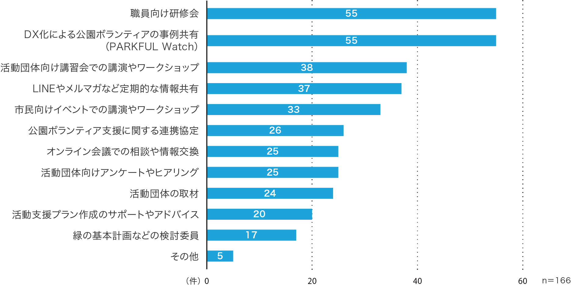 活動をしやすくするための用具庫や掲示板の設置、活動内容の広報や周知の協力、モチベーション向上のための表彰や団体間の交流促進支援、技術指導や研修会、専門家の派遣、情報誌の発行、イベント企画支援、公園利用に関する優遇など、さまざまなサポートが行われていることがわかった。