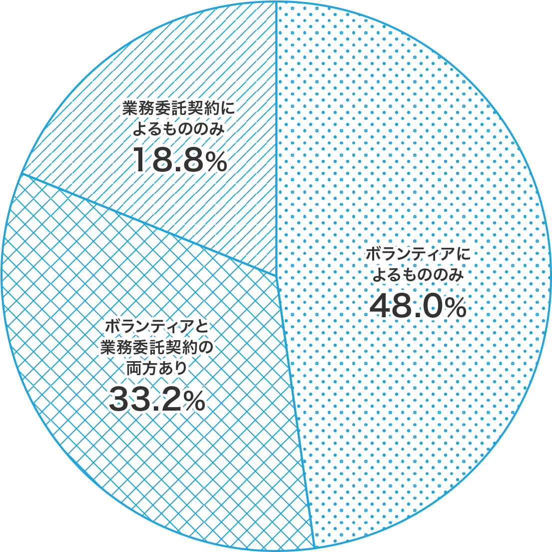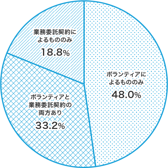 264(81.2%)の自治体でボランティア活動が行われており、169(52.0%)の自治体で自治会町内会など地縁団体への業務委託が行われていることがわかった。ボランティア活動と業務委託の両方が行われている自治体も108(33.2%)あった。