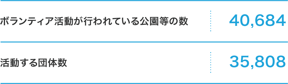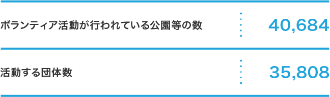 今回の調査では、様々な制度の下で、40,684の公園等で、35,808の団体がボランティア活動をしていることがわかった。 これには地域住民への業務委託による公園育ては含まれない。