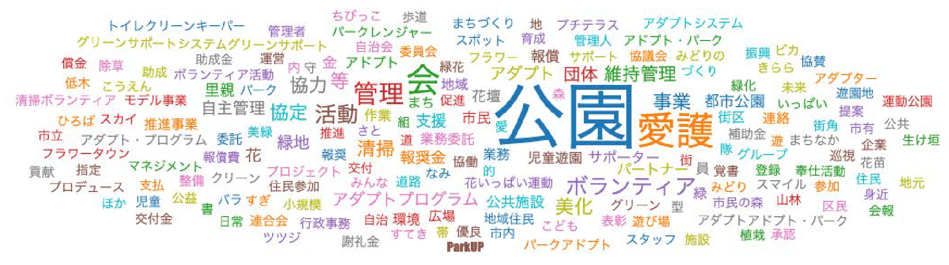 そのほか、アダプト、アドプトなど「里親」系の名称、自主管理、管理協定、美化、ボランティアなどの文言も多く確認された。