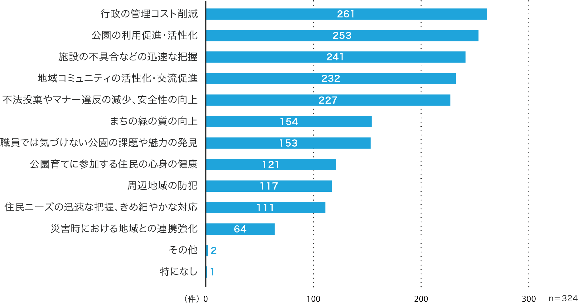 そのほか、まちの緑の質の向上(47.5%)、職員では気付けない公園の課題や魅力の発見(47.2%)、公園育てに参加する住民の心身の健康(37.3%)、周辺地域の防犯(36.1%)、住民ニーズの迅速な把握