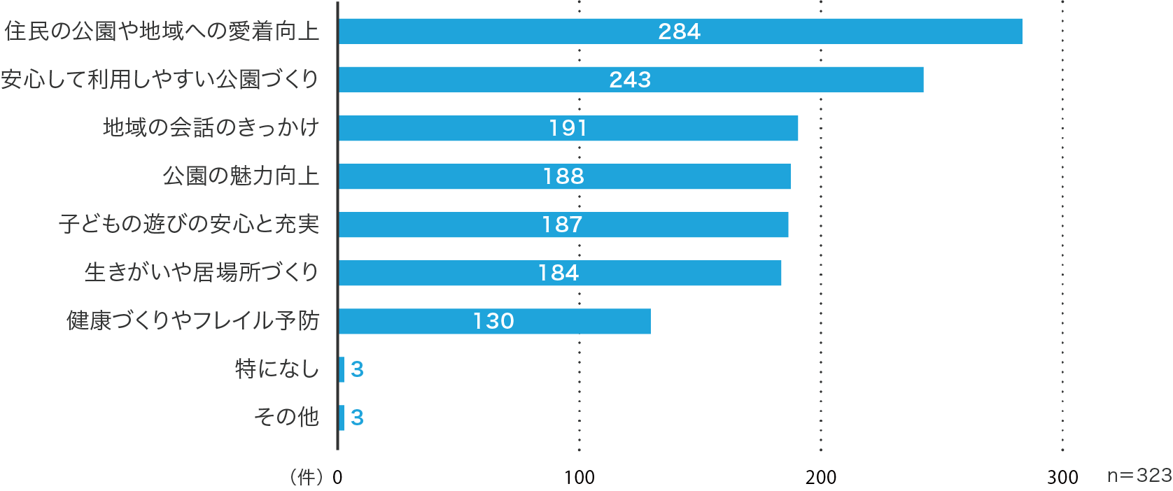 行政からみた、コストの削減などの財政メリット、公園利用促進、公園の質や安全性の向上に加え、愛着形成や地域コミュニティ、会話のきっかけ、生きがいや居場所づくりといった公園利用者や地域住民からみた精神的・社会的な豊かさにつながる価値も大きいことが、改めてよくわかる結果となりました。