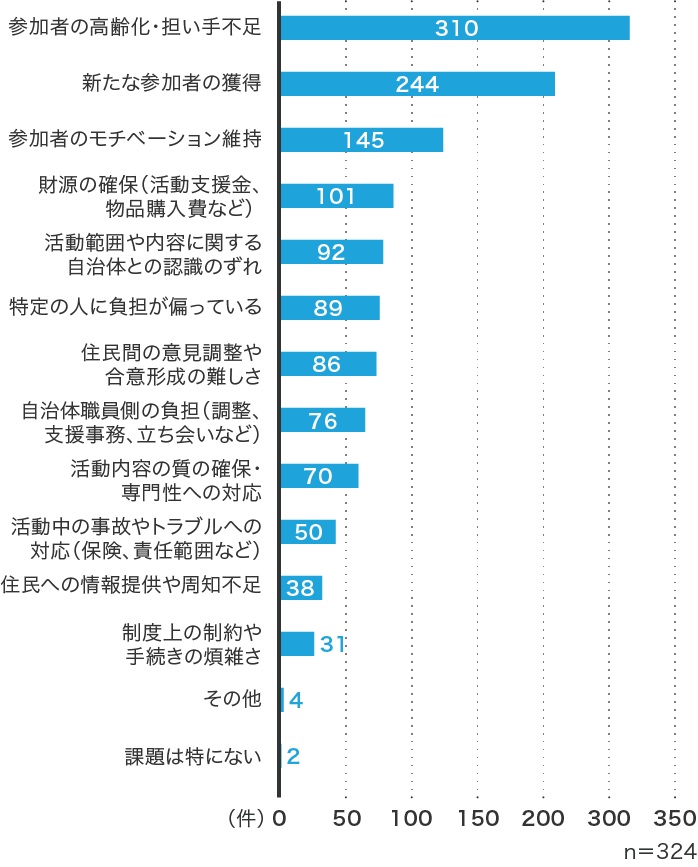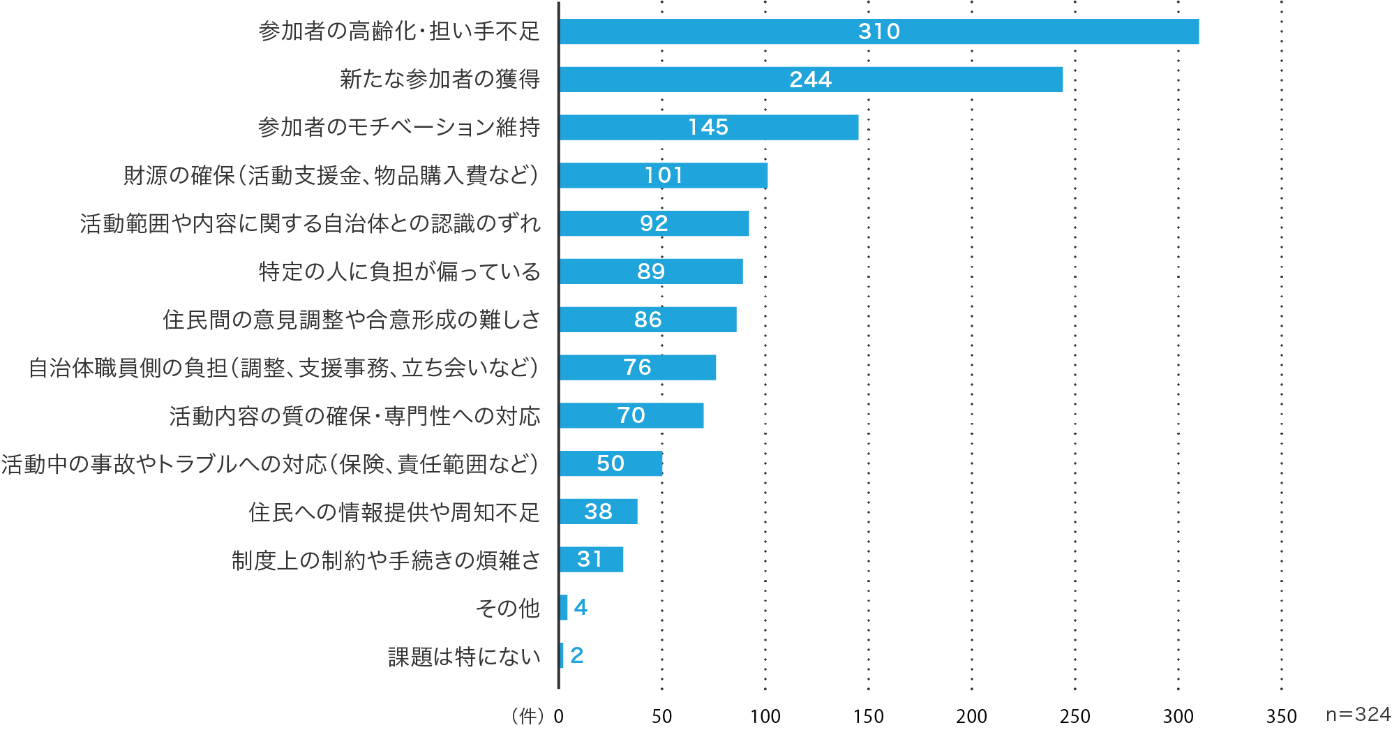 そのほか、財源の確保(活動支援金、物品購入費など)(31.4%)、活動範囲や内容に関する自治体との認識のずれ(28.6%)、特定の人に負担が偏っている(27.0%)、住民間の意見調整や合意形成の難しさ(26.0%)、自治体職員側の負担(調整、支援事務、立ち会いなど)(23.5%)、活動内容の質の確保・専門性への対応(21.0%)、活動中の事故やトラブルへの対応(保険、責任範囲など)(15.6%)、住民への情報提供や周知不足(11.7%)、制度上の制約や手続きの煩雑さ(9.5%)など、さまざまな課題があることもわかる。