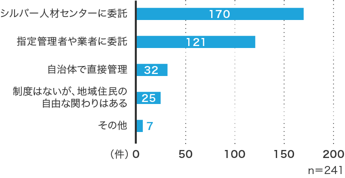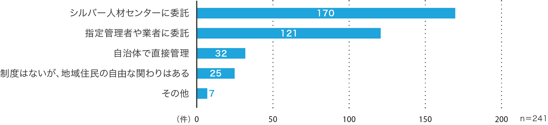 地域住民の関わりがない場合の小規模公園の維持管理については、シルバー人材センターに委託(70.5%)が最も多く、次に指定管理者や業者に委託(50.2%)、自治体で直接管理(13.3%)、制度はないが地域住民の自由な関わりはある(10.4%)となった。