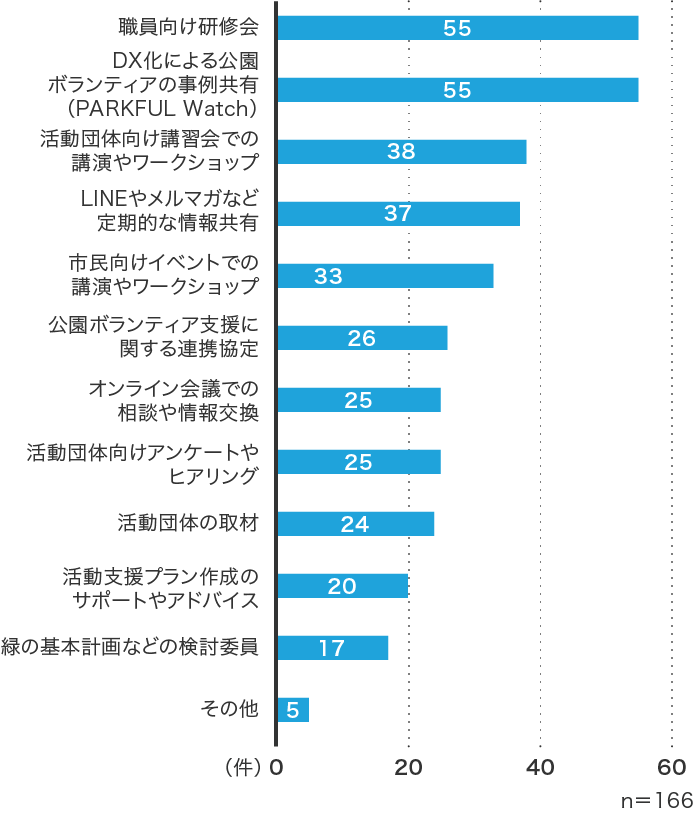 みんなの公園愛護会との協業で最も関心のある項目としてあがったのは、職員向け研修会とDX化による公園ボランティアの事例共有(PARKFUL Watch)(ともに33.1%)、活動団体向け講習会での講演やワークショップ(22.9%)、LINEやメルマガなど定期的な情報共有(22.3%)、市民向けイベントでの講演やワークショップ(19.9%)と続いた。