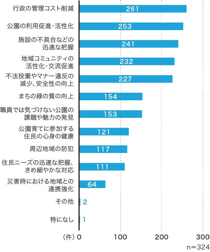 公園ボランティア活動のある自治体においては、「公園の利用促進・活性化」が「管理コスト削減」を上回り1位となった。大きな傾向は変わらないものの、業務委託とボランティアの関わり方の違いで、もたらす価値や効果が少しずつ違っていることもわかる。