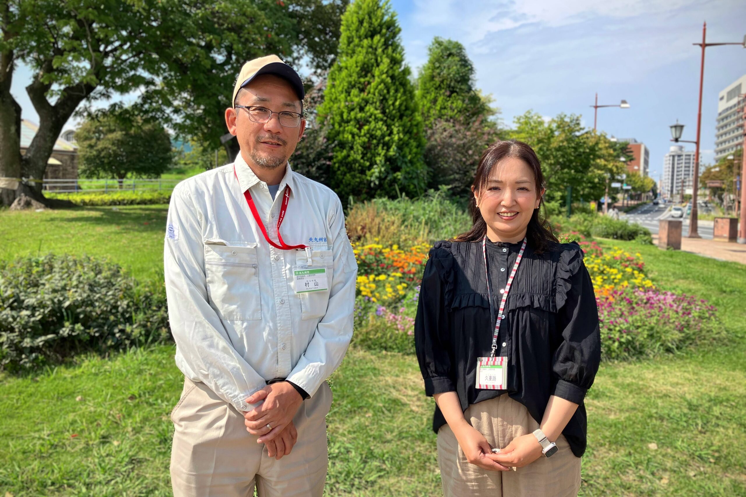 そこで今回は、地域住民による公園愛護会活動に加えて、企業や学校などのボランティアが公園育てを担う「北九州市公園応援団」について、北九州市 都市整備局 河川公園部 公園管理課 管理係長 村山英亮さん(上の写真左)、ご担当の久重路由賀さん(同 右)にお話をお聞きしました。