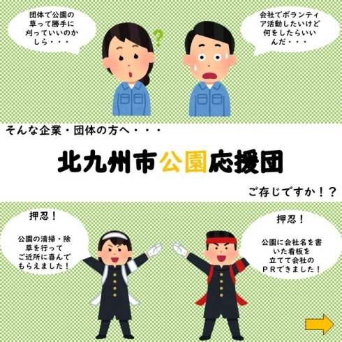 先日お話をお聞きした福岡市の「企業版公園愛護会」で参考にした他都市の取り組みとして、北九州市の「北九州市公園応援団」をご紹介いただきました。