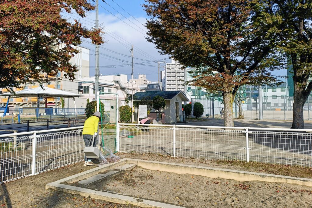 吉野町公園にはJR野田駅、大阪メトロ玉川駅から歩いて10分ほどでアクセスすることができます。すぐそばに交通量の多い北港通がありますが、平日の朝ということもあり、公園内は落ち着いた雰囲気で、ゆったりとした空気が流れていました。