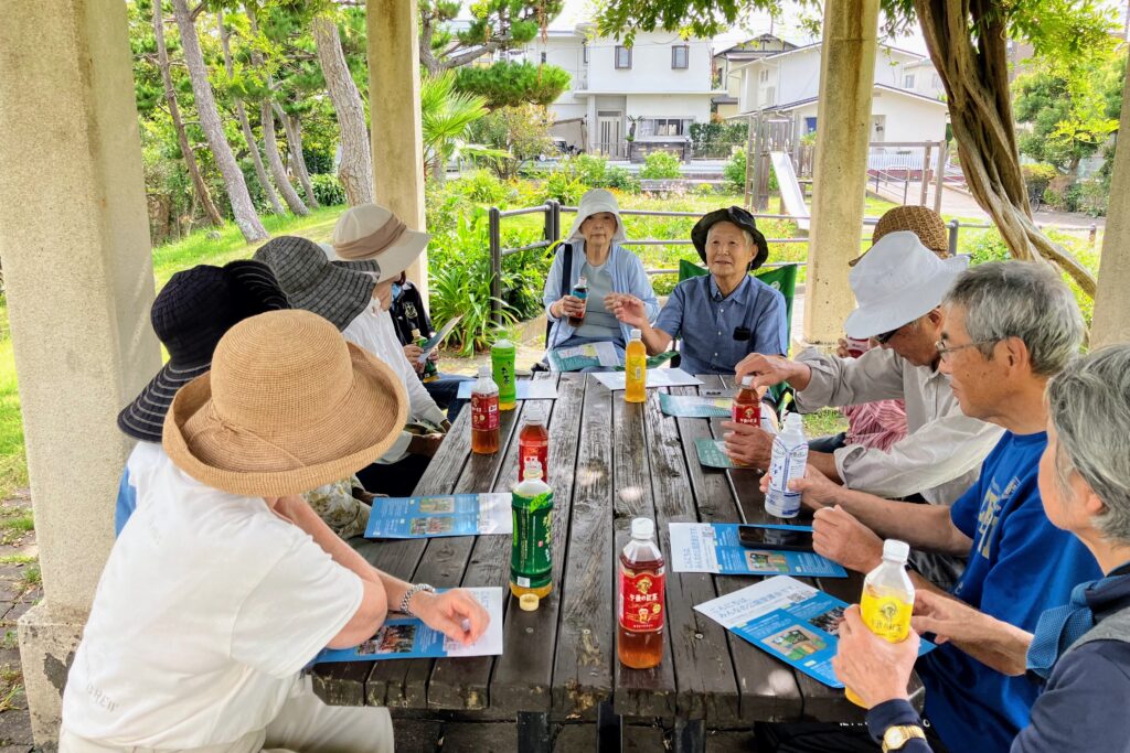 お手入れ作業の様子を見せていただいた後、藤棚のテーブルを囲んで、公園や愛護会の歴史を振り返り、さまざまなお話を聞かせていただく楽しい時間となりました。