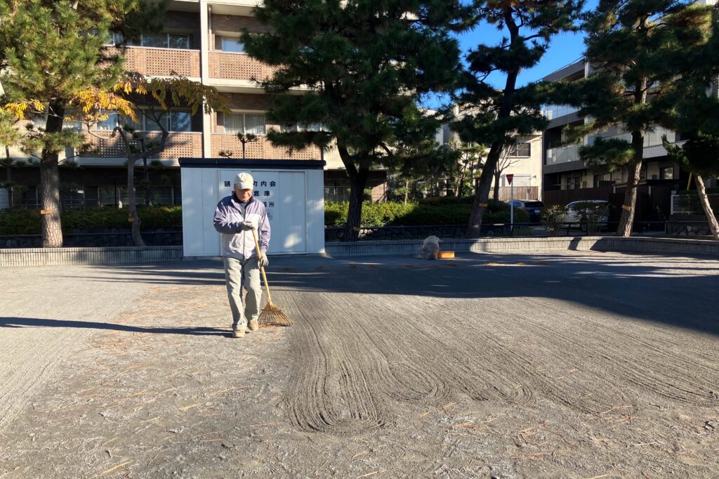 園内の広場や一段高い樹木エリア、さらに外周の道まで丁寧に掃き進めるみなさん。園芸用ふるいや、穴のあいた「てみ」を使い、落ち葉と砂を上手に仕分けます。尖ったマツの葉で袋が破れないよう気を配りながら、手際よく作業が進みます。