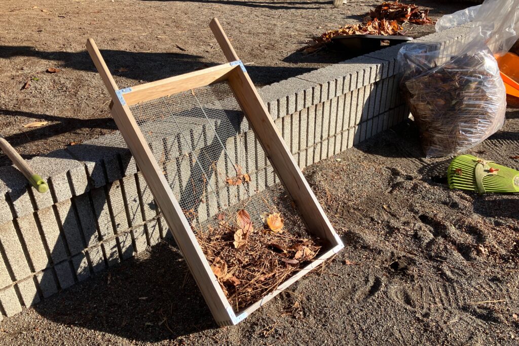 (落ち葉と砂を分ける園芸用ふるい、大活躍!)