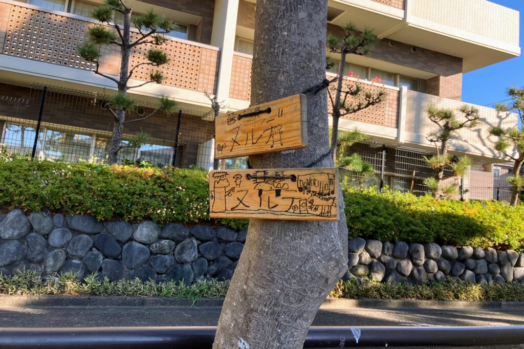 橘公園にある樹木のほとんどには樹名板がつけられています。これは、近くの保育園の子どもたちと一緒に作っているもので、卒園記念として毎年つけているそう。子どもたちのかわいい文字や絵が書かれた樹名板は、見ているだけでつい笑顔になってしまいます。