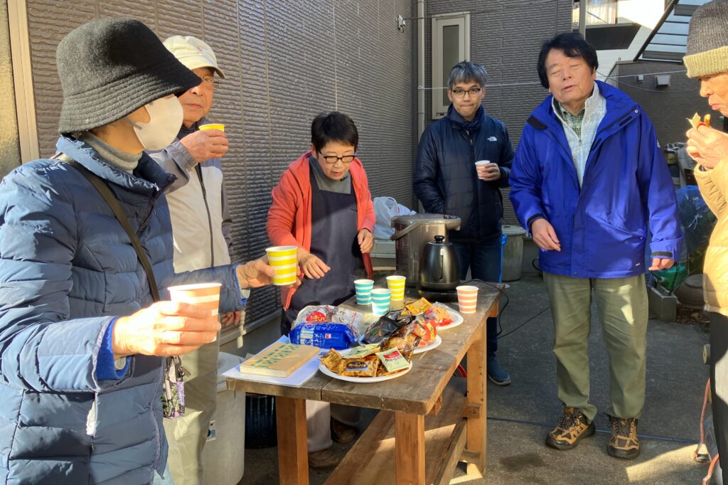 活動がひと段落すると、お楽しみのお茶の時間です。公園の目の前にあるメンバー宅の庭先にテーブルを出し、コーヒーとお菓子を囲んでのおしゃべりタイムが始まりました。