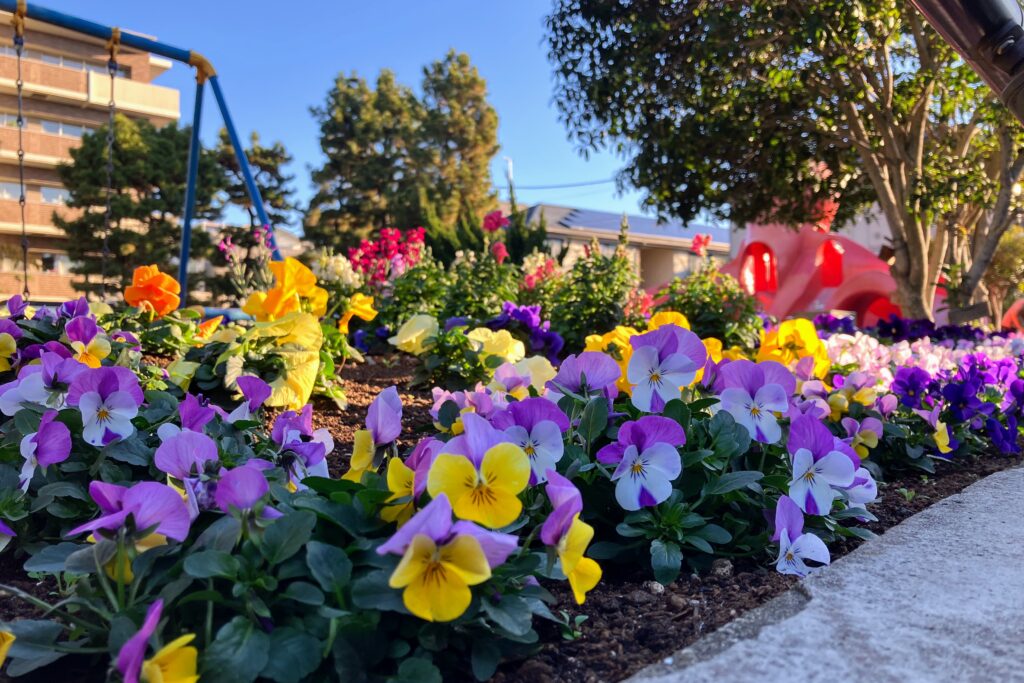 色とりどりの花壇は、春と秋に地域の子どもたちと一緒に植えています。11月に植え替えた冬の花壇には、パンジーやビオラ、ストックといった花が彩りを添えていました。