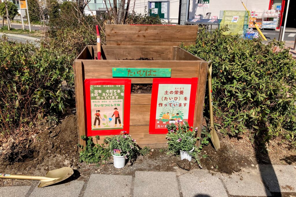 こすぎ公園の循環型花壇は、家庭の生ごみを自宅のコンポストで堆肥化したものを集めて、公園の堆肥箱(コミュニティコンポストと呼んでいました)で2次熟成し、花壇に入れて花を育てるというもの。