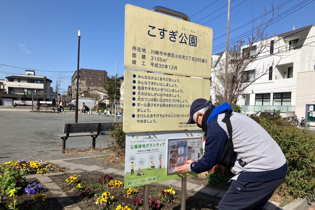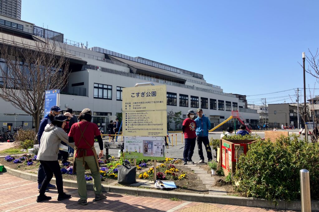 川崎市中原区にある「こすぎ公園」。JRや東急の武蔵小杉駅から歩いて10分ほど、学校や商業施設・住宅が立ち並ぶ街の中にある街区公園です。おとなりに移転した日本医科大学の跡地に、小学校と一体的に整備された公園の周辺では、今もタワーマンションや日本医科大学病院が建設の真っ只中、まさに再開発で変化し続ける地域の中にある公園です。