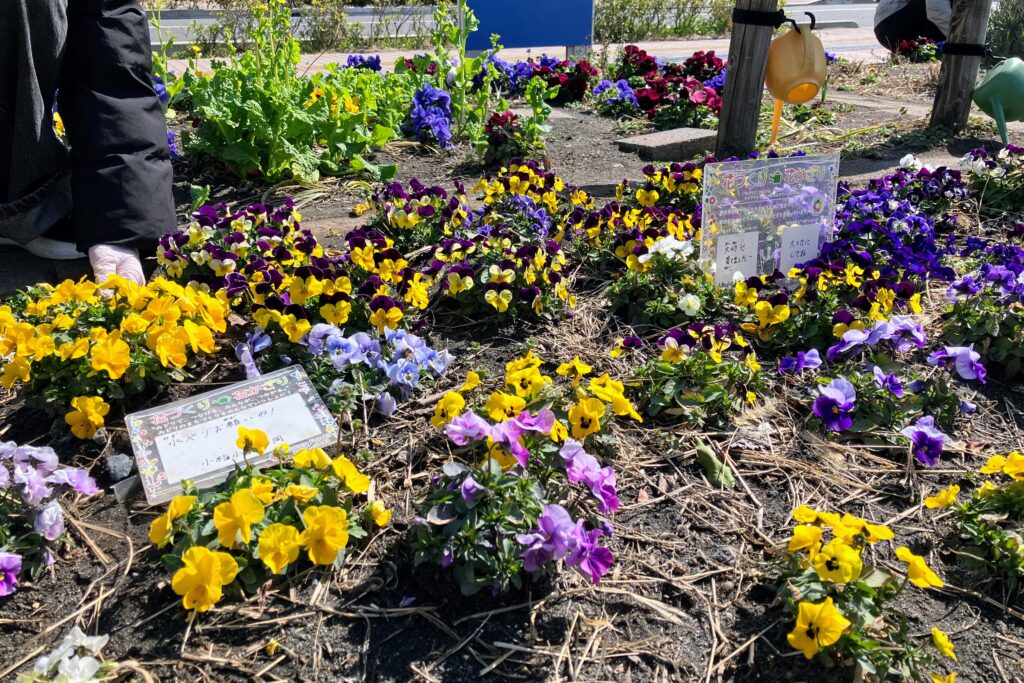 公園の入口を彩る花壇は、6区画に分かれていて、近隣の保育園など6つの団体が花植えをして、みんなでお世話をしています。この日は、参加者のみなさんで、花がらつみと花のまわりに堆肥をあげるお手入れ作業が行われました。春と秋の植え替えの前には、コンポストの堆肥を土に混ぜ込む作業もみんなでするそうです。