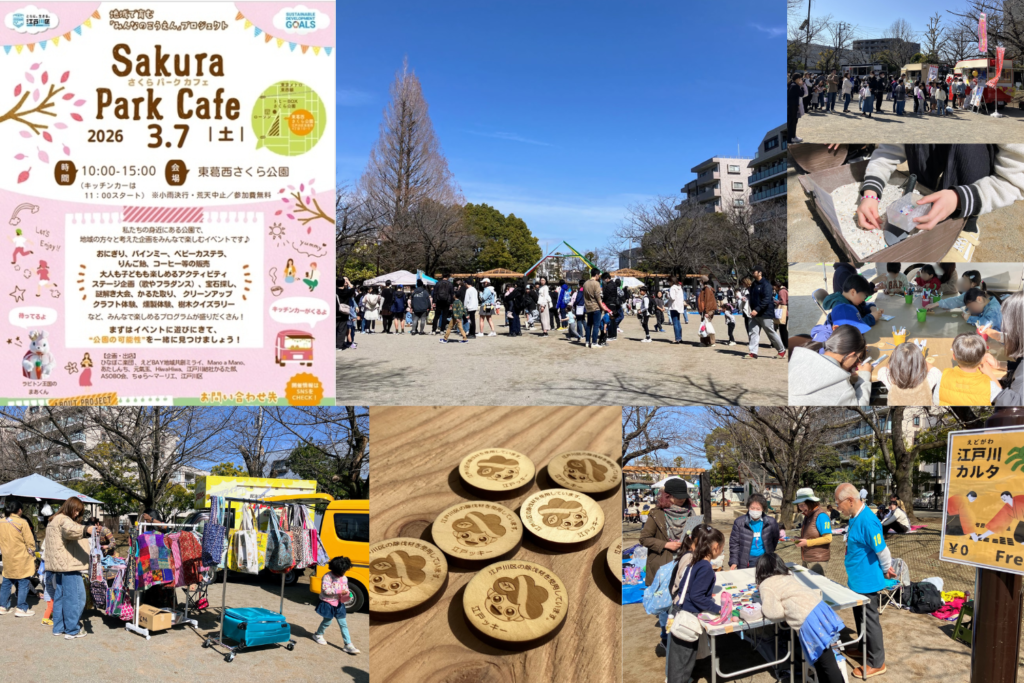 各地の公園ボランティア活動を紹介する「となりの公園愛護会」。今回は、東京都江戸川区の「地域で育む みんなのこうえんプロジェクト」でみんなのこうえんサポーターとして活躍されている、こちらのみなさんです。3月に行われた東葛西さくら公園のパークカフェイベントにお伺いしてきました。