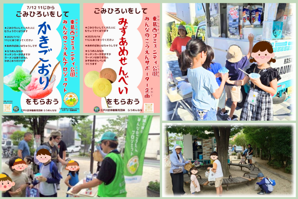子どもたちがたくさん遊びにくる公園なので、子どもたちが集まる夕方に合わせて公園に出ていき、一緒にごみ拾いや花の水やり、落ち葉清掃などをされているというななさん。「ごみ拾いをしたら〇〇をもらおう!」というお楽しみ企画では、かき氷やみずあめせんべいなどをプレゼントし、元気な子どもたちに地域活動への参加の機会づくりをされています。子ども食堂もやっているので、寄付食材などを、子どもたちのごほうびにすることもあるそう。