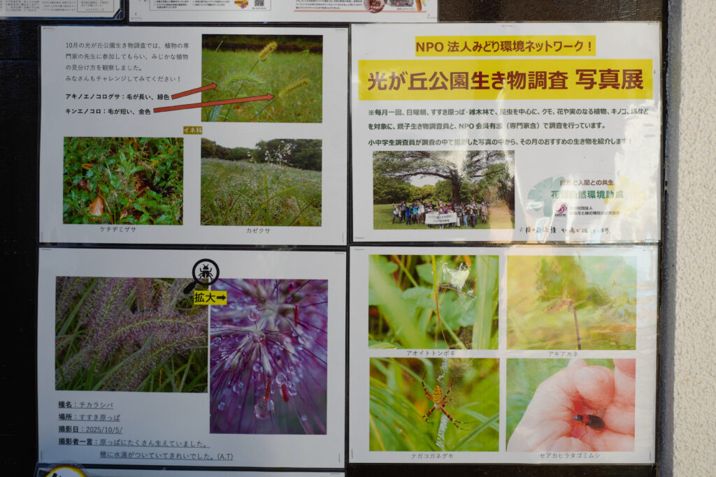 その活動の核となっているのが、「光が丘公園生きもの調査」です。調査員は小学生親子で、対象は昆虫・野鳥・哺乳類から植物まで多岐にわたり、年間を通じて園内の動植物を定点観測し、年度末には報告会を行う本格的な調査活動です。