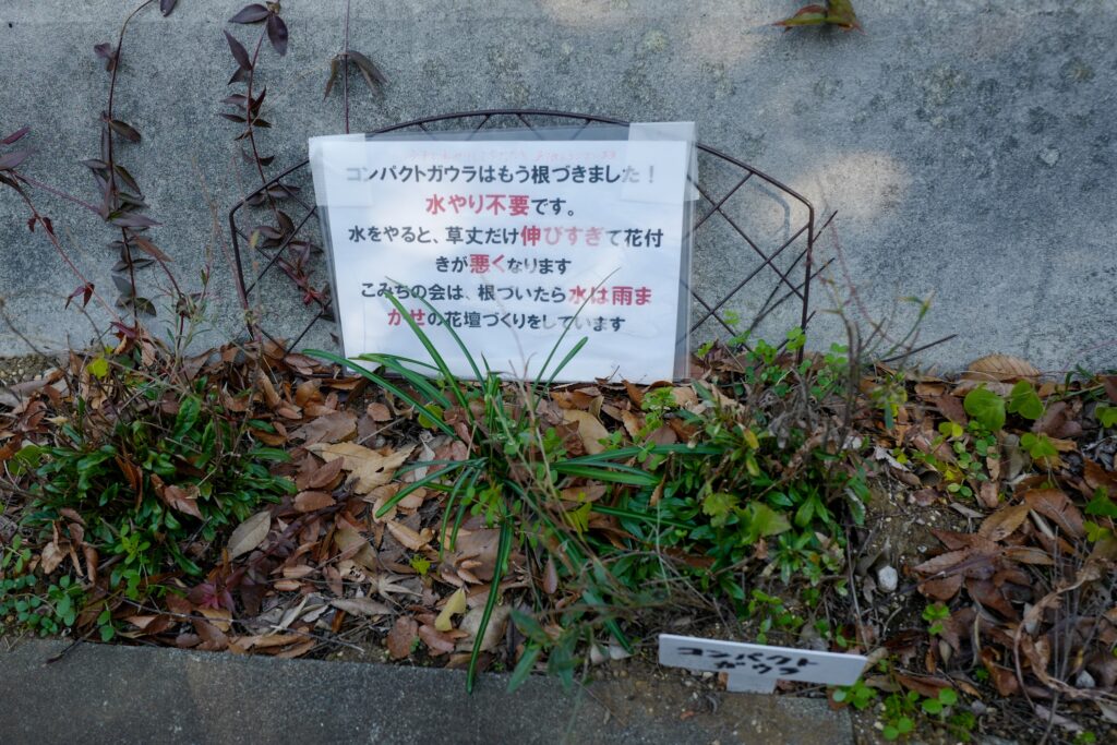 (水やりが不要な理由をしっかりと説明する看板。地域への気遣いが感じられます)