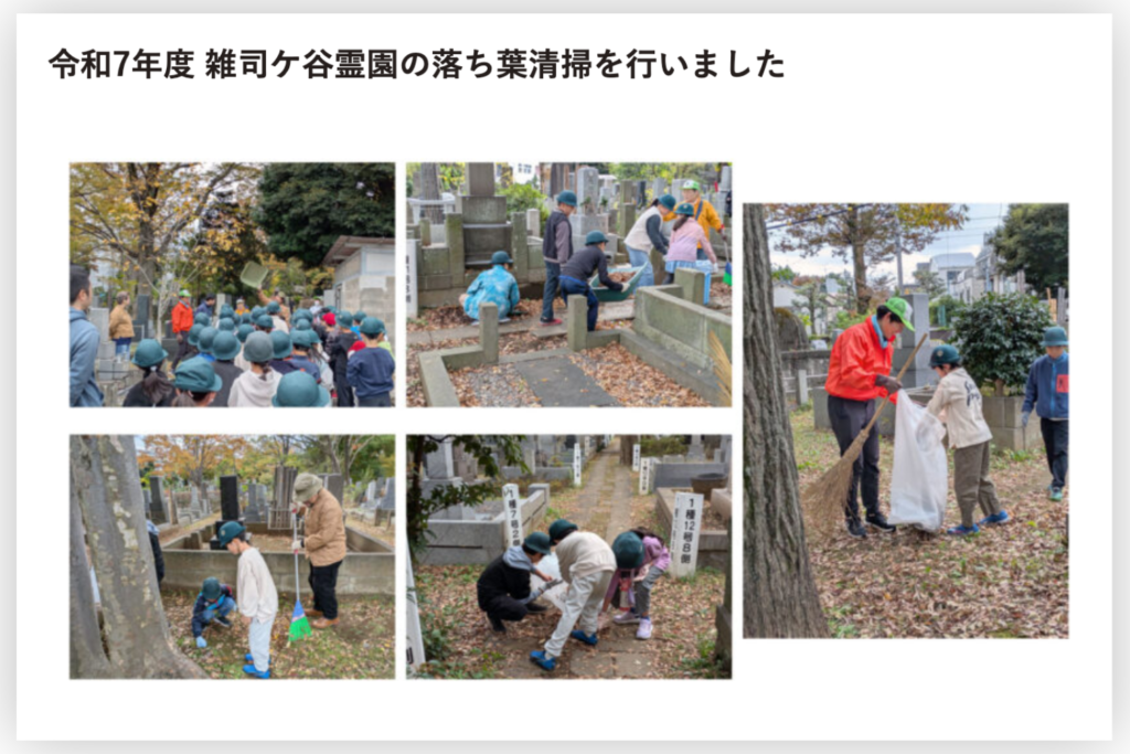 (毎年恒例の南池袋小学校3年生と行った落ち葉清掃の様子。3年生106名が参加。写真は雑司が谷未来遺産WEBサイト雑司が谷トピックスサイトでの紹介より)