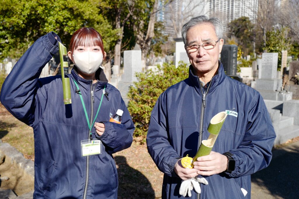(雑司ケ谷霊園管理事務所職員のお二人。手に持つのは、緑のこみちの会メンバーお手製の門松を再利用した一輪挿し)