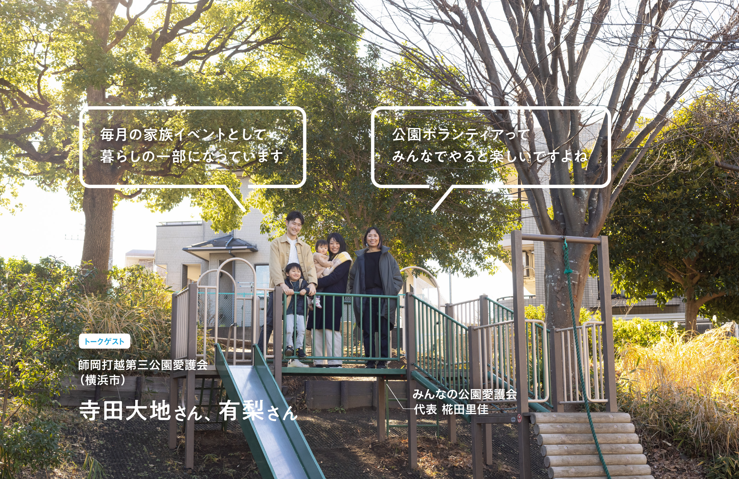 椛田 今回寺田さんご夫妻にお話を伺って、子育て世代の楽しみとしての公園ボランティアの可能性を感じました。これからも、いろいろな会話をしながら、一緒に繋がりを広げていけたらと思います。